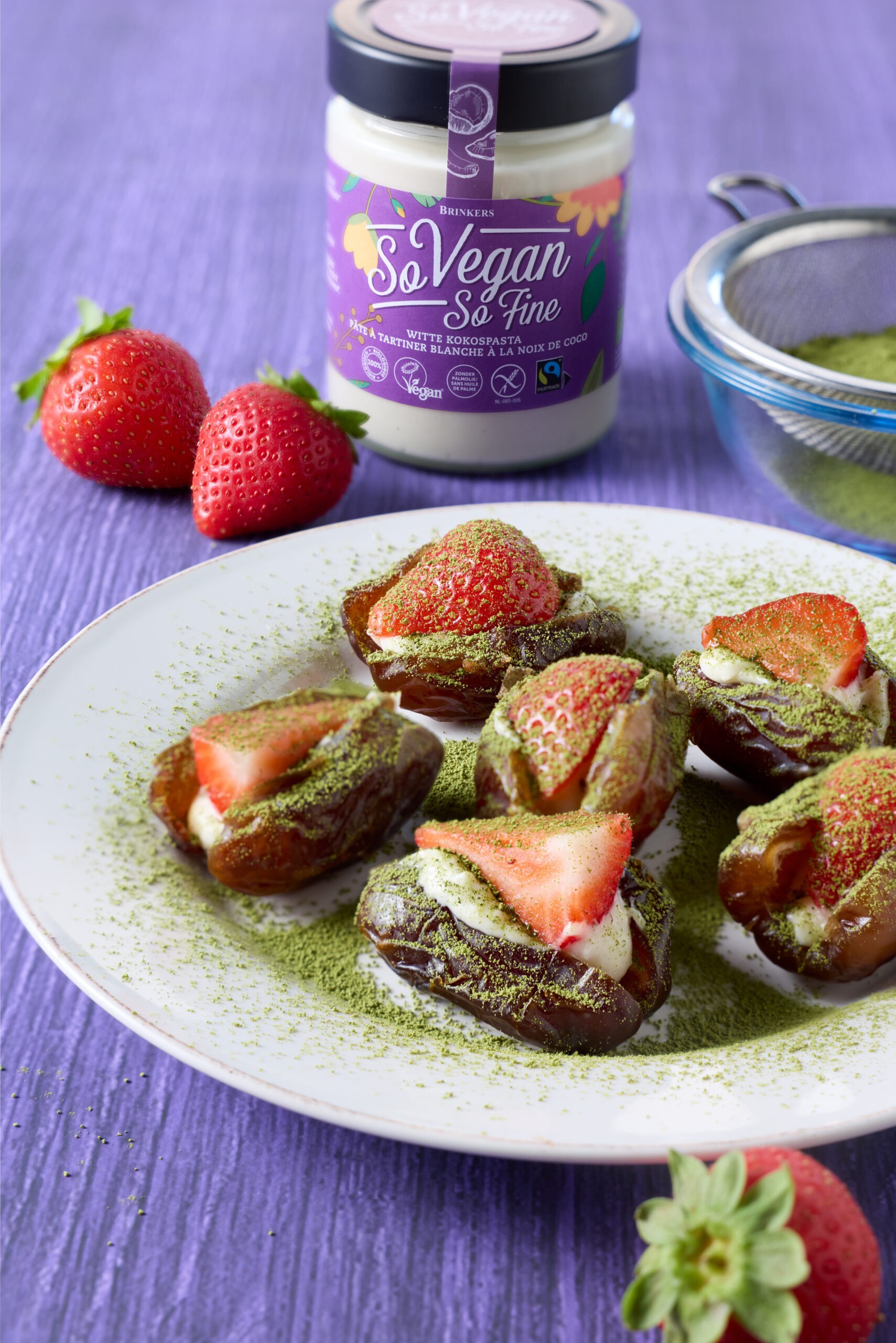 Voor ca. 6 stuks Bereidingstijd: 10 minuten Ingrediënten: 6 medjooldadels, ontpit 4–6 tl So Vegan So Fine Witte Kokos Spread 2…